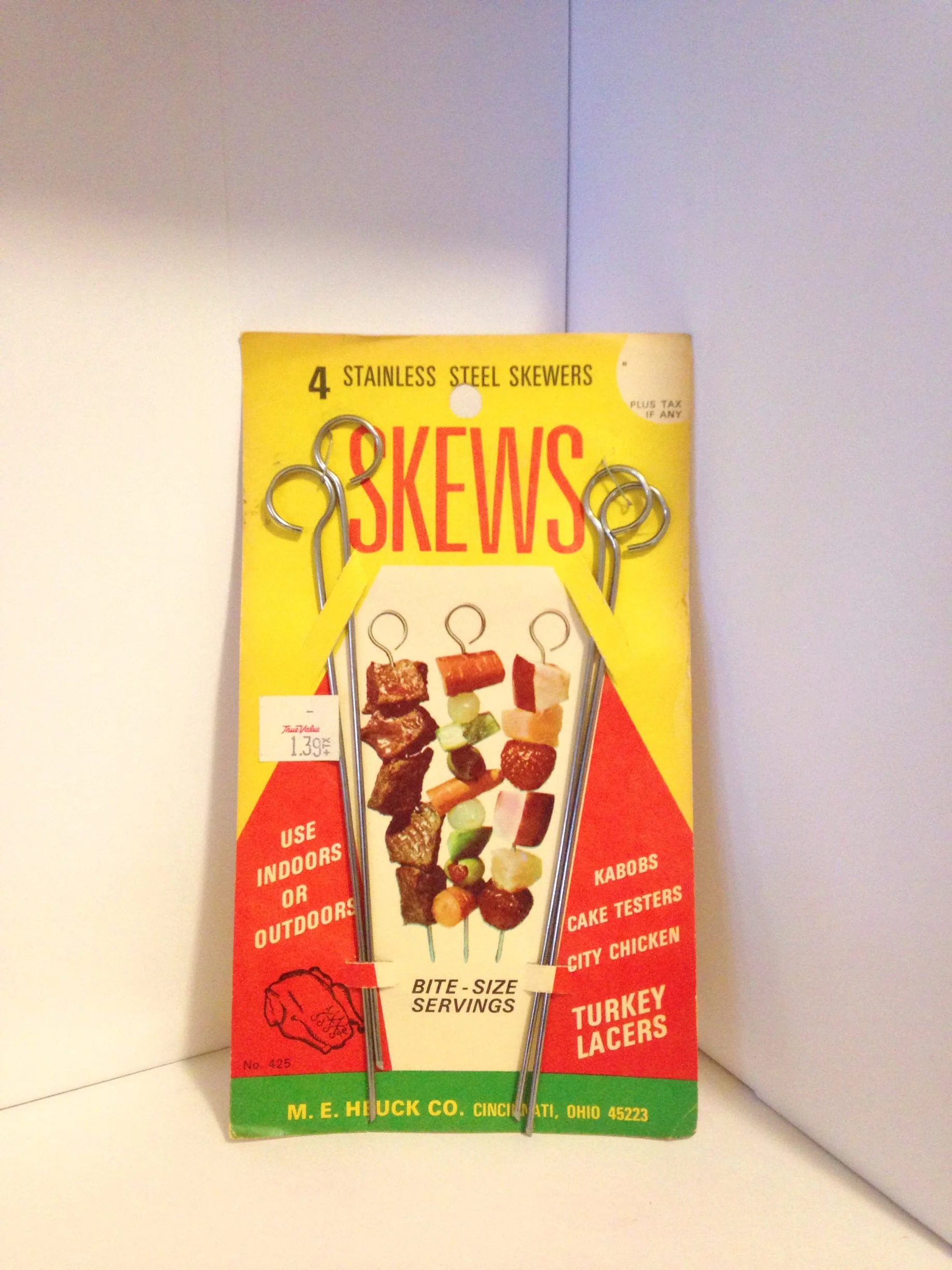 SOOO much good stuff here: the cool name for skewers, the variety of uses, the price point, the fact that these are an indoor/outdoor item and the food stack-up on the middle skewer!